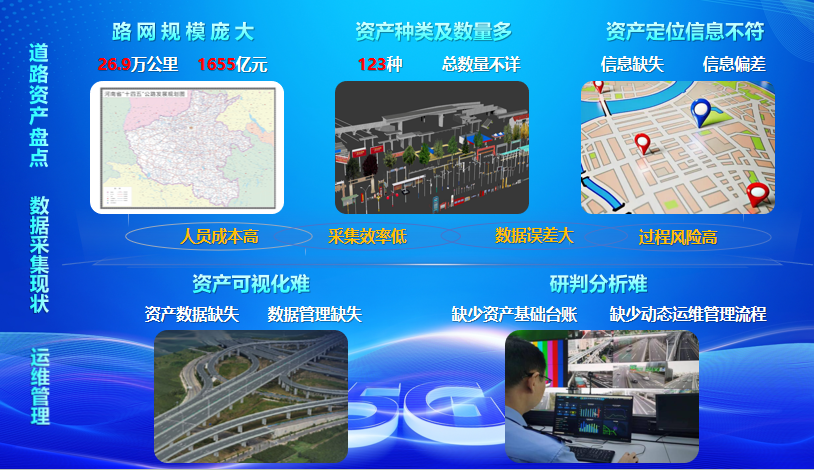伴随着我国交通公路网的高速发展,路网规模庞大,道路资产种类及数量多,总体里程高达26.9万公里,种类超过123种,总规模达1655亿元,道路资产定位信息缺少或偏差等问题急需解决。道路资产明细不清晰,会增加道路维护的成本和难度,影响道路安全和通行能力。传统的道路资产数据采集呈现出成本高、效率低、误差大、风险高等痛点。