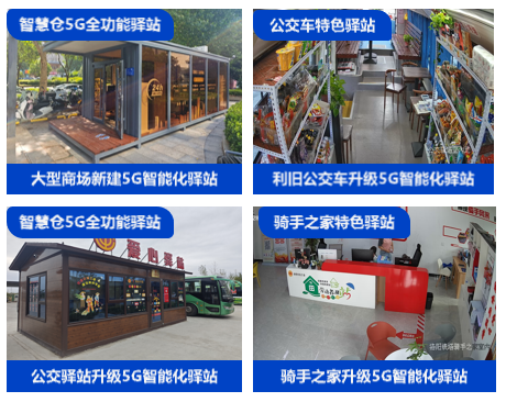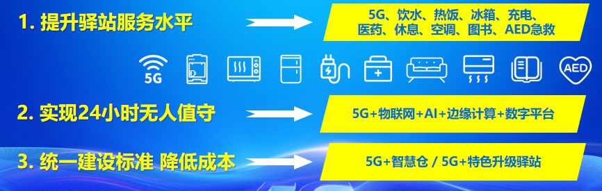 在传统驿站基础上,提供微波炉、冰箱、医药、AED等服务,并集成了5G网络、物联传感器、智能化监控、远程云广播,远程用电管理,并设有零工驿站招聘信息板块,全方位服务于户外劳动者的工作与生活需求。