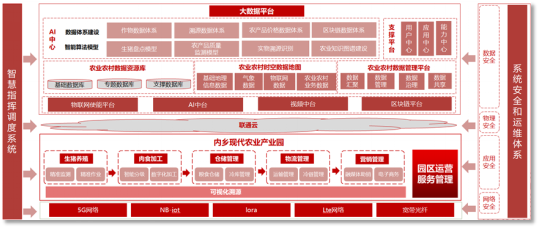 内乡县国家农业产业园平台通过大数据、物联网、5G、MEC、人工智能等技术,整合园区内企业信息,通过网络解决园区和企业之间信息孤岛的问题,推动园区安全、绿色、高效发展;通过信息化、智能化数据接入智慧平台让园区自动获取园区内企业的数据;建立智慧监管综合服务平台和运营运维体系,完成产业园区的安全管理。