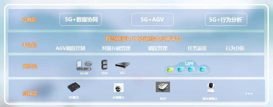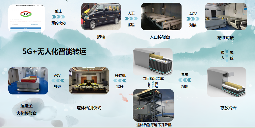5G+智慧殡葬AGV项目将5G专网、边缘计算、物联网等技术,转化为生产力,惠济居民生活,借助技术把悲伤的场景做成“特殊的生命交流”,推进智慧殡葬科技亮度。