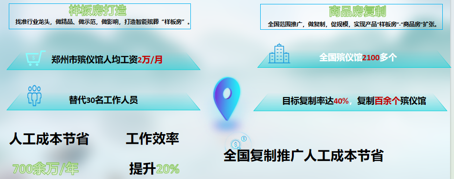 作为政府惠民工程,旨在助力政府通过优化服务流程,为民生排忧解难,体现政府惠民力度;让治丧群众得到慰藉,殡葬从业人员少受偏见,殡葬服务形象得到提升。既解决了当下社会传统文化矛盾,又解决了实体运营的问题。同时该项目的应用,很好的解决了殡仪馆用工难、成本高的难题,在体现人文关怀的同时,实现了殡葬行业的降本增效。