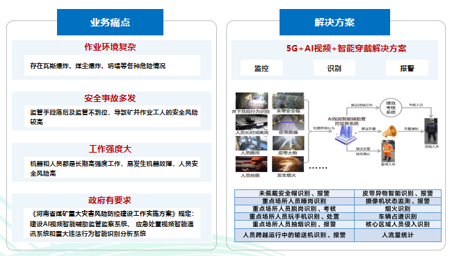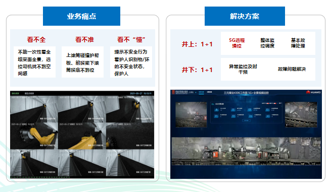 5G+视频辅助远控:在掘进面作业场景,针对工作环境差、网络不稳定、作业效率低的业务痛点以及掘进事故占全部事故40%以上的高比重,河南移动通过“5G+AI”提供双光融合视频和AI分析来辅助远程控制,场景改造后可减员至0人并提升30%生产效率。