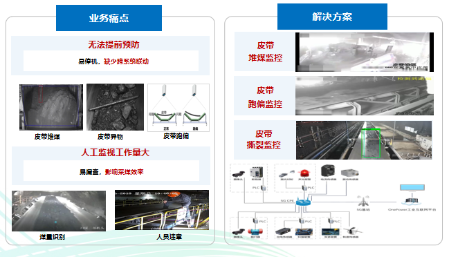 5G+皮带监测系统:在运输作业场景,针对危险区域无法提前预防、人工巡检工作量大业务痛点,河南移动通过“5G+皮带监测系统”提供视频AI智能识别和24小时精准监控告警来代替工人巡检,场景改造后该场景可减员8人且减少停机处理事故时间。