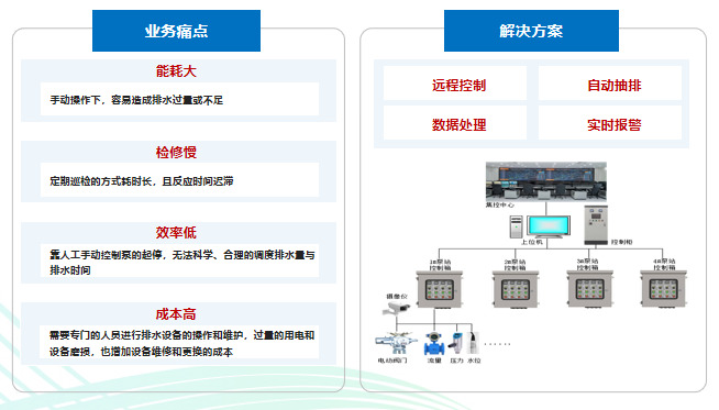 5G+智能排水管控:在排水作业场景,针对能耗大、效率低、检修慢、成本高的业务痛点,河南移动通过“智能排水管控系统方案”提供远程控制、自动抽排、数据处理、实时报警等功能,场景改造后可减员至0人且保持24小时不间断监控预警。