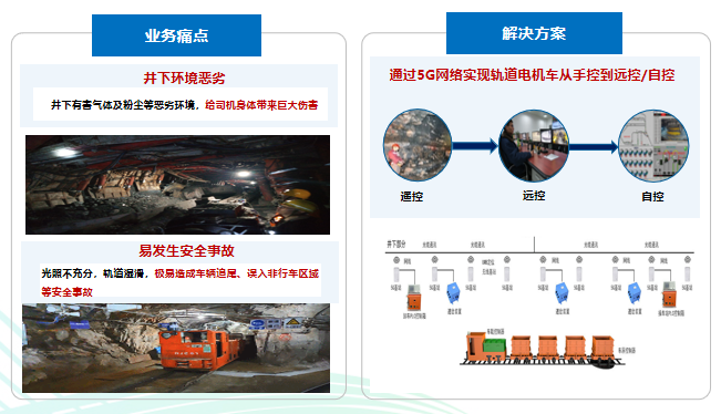 5G+轨道电机车无人驾驶:在运输作业场景,针对井下工作环境差、轨道车辆易发生追尾事故痛点,河南移动通过“5G+轨道电车无人驾驶解决方案”提供轨道电机车全程自动化无人驾驶、多种驾驶模式切换等功能,场景改造后该场景可减员至0人且实现远程控制和实时调度。