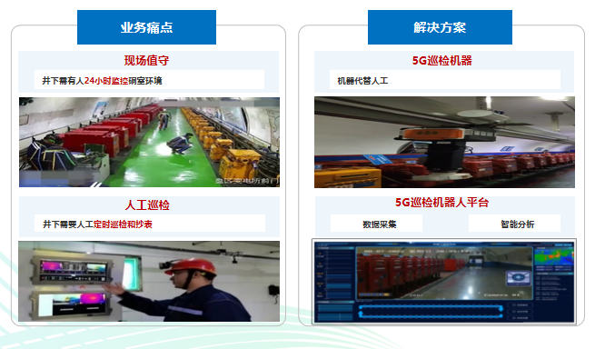 5G+AI机器人巡检:在机电硐室作业场景,针对传统巡检中需要井下人员现场值守和人工巡检的问题,河南移动通过“5G+AI巡检机器人”代替人工24小时不间断监控巡查,场景改造后可减员至0人并保持24小时不间断监控预警。