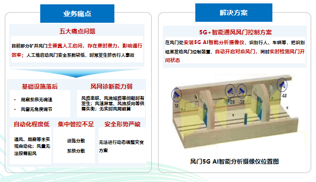 5G+智能通风风门控制:在通风作业场景,针对矿井风门基础设施落后、风网诊断能力弱等五大痛点问题,河南移动通过“5G+智能通风风门控制”提供AI分析来辅助风门控制,改造后该场景可减员6人且年通风能耗降低约10%。